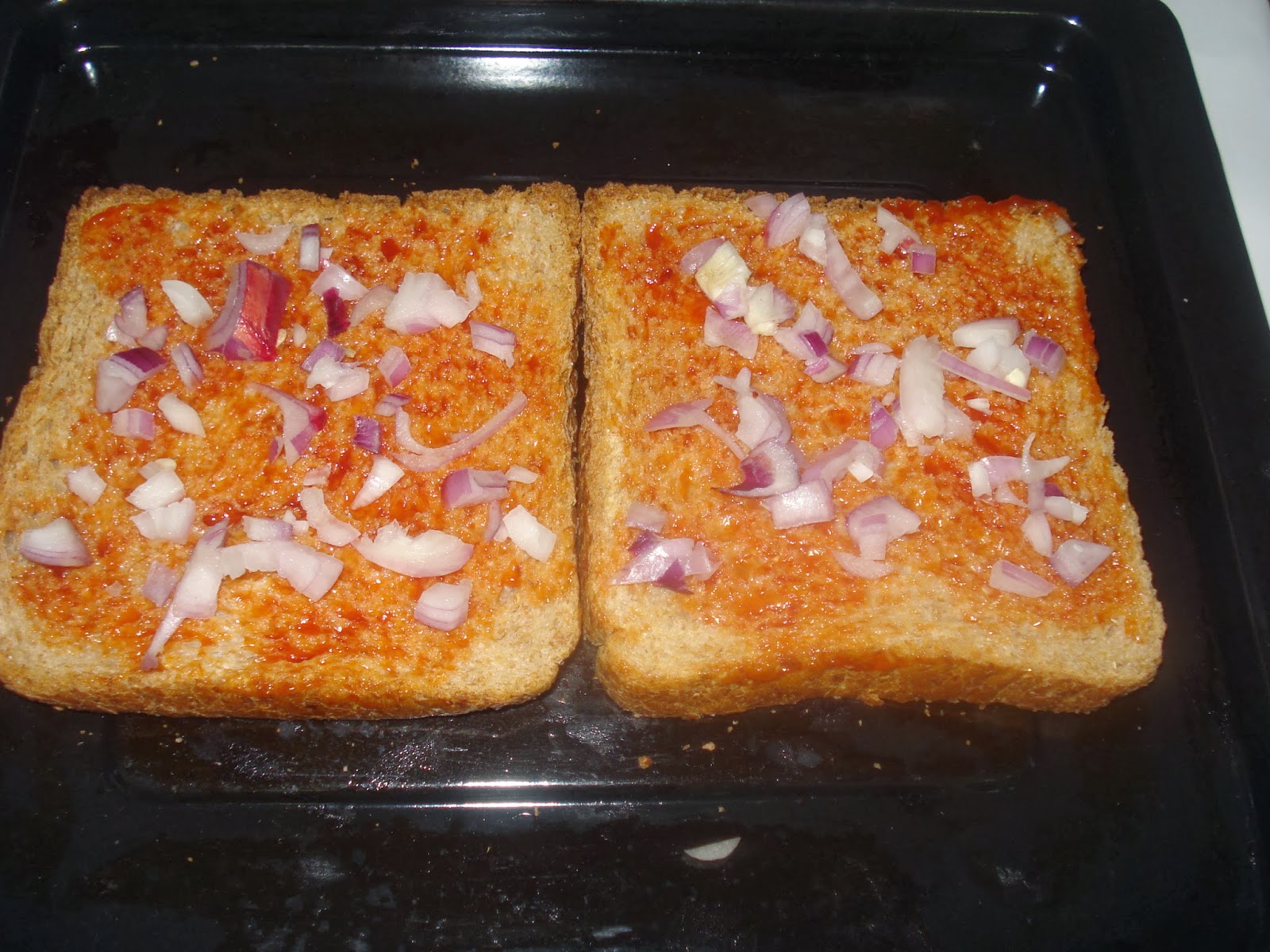 1. Chop all the veggies as per the method. Take the bread slices and spread the pizza sauce on one side.